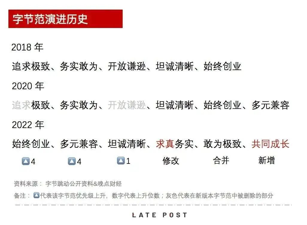 其中,“始终创业” 从字节范第五位调整到第一位;“多元兼容” 从最后一位提高到第二位;新增了“共同成长”。