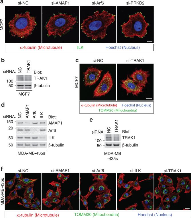 D-F 浸润性、侵袭性强的乳腺癌细胞系MDA-MB-435中,AMAP1、Arf6、ILK或TRAK1的敲低显著抑制线粒体的细胞质外围分布,趋向于中心聚集。