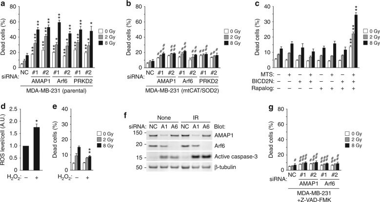 G. 泛Caspase抑制剂Z-VAD-FMK处理后,Arf6-AMAP1通路对电离辐射敏感性的影响降低。这些结果表明线粒体聚集引起ROS增加,是通过活化Caspase3凋亡途径实现细胞死亡。