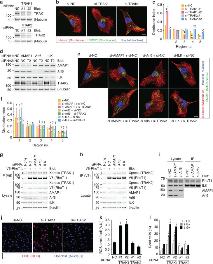 G. H. 敲除AMAP1、Arf6或ILK后,RhoT1与TRAK2的结合能力明显增加,但是不影响RhoT1与TRAK1的结合。