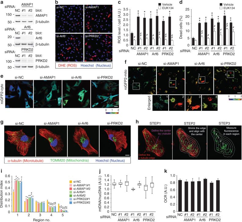 C.D 用siRNA敲低Arf6-AMAP1信号通路增加ROS水平并促进细胞死亡,使用EUK134(过氧化氢酶类似物)后抑制ROS水平。
