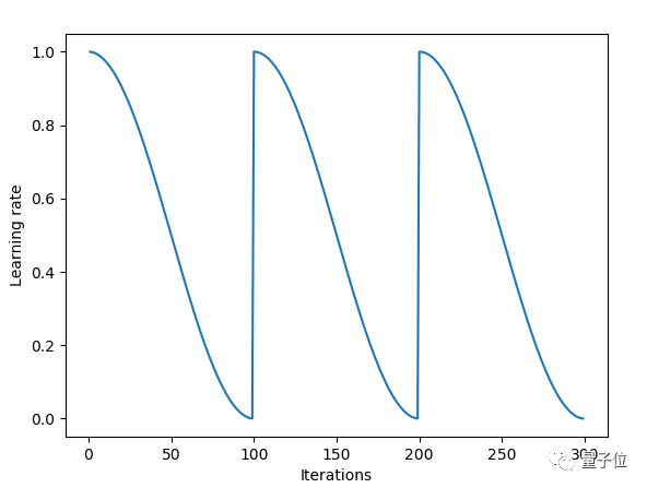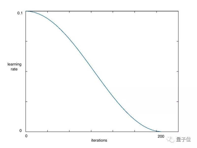 从上图可以看出,随着x的增加,余弦值首先缓慢下降,然后加速下降,再次缓慢下降。这种下降模式能和学习率配合,以一种十分有效的计算方式来产生很好的效果。