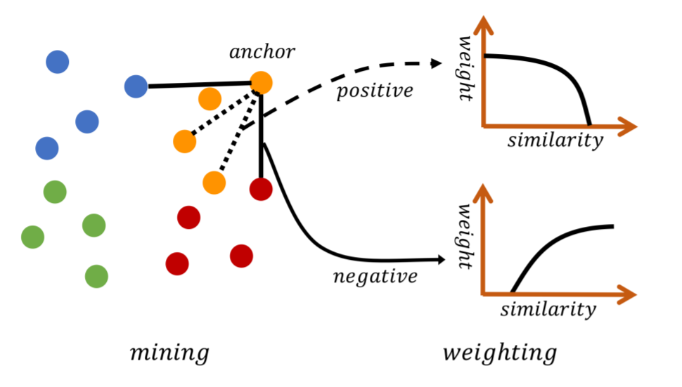 第二阶段的加权则是在采样的基础上进行的,第一阶段采样的样本有正样本(黄色)也有负样本(红色、蓝色),我们需要另外两种相似性来确定它们的重要性。具体而言,如果正样本相似性越高,那么加的权就越少,因为它已经不太需要进一步拉近距离。但如果负样本的相似性太高,就表示它离 anchor 非常近,我们需要提供更大的权重以使模型把它们推地更远。