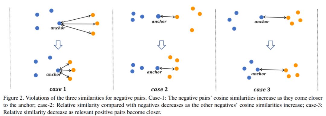 在 case 2 中,即使 anchor 与负样本的自相似性不变,但我们还需要考虑负样本的近邻。如果负样本间的自相似性增加,那么它与 anchor 间的相对相似就自然降低。case 3 也是同样的道理,正样本间的自相似要是增加了,那么 anchor 与负样本的相对相似性就要降低。
