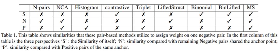 如下表所示,基于样本对的各种损失函数都可以归类到这三种相似性,目前只有该论文提出的 MS Loss 能同时考虑三种相似性。