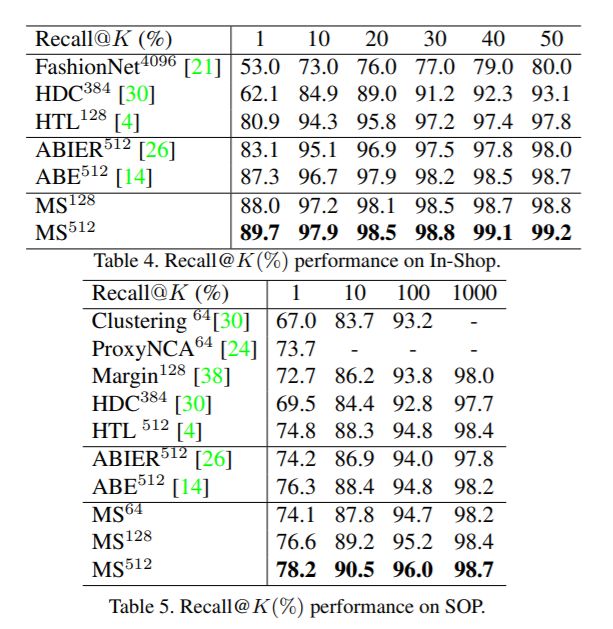 无论是Cars196和CUB200这样的细粒度数据集,还是SOP和In-Shop这样的大类别数据集,该论文提出的方法都能获得新的最佳或相当的性能,即使其他方法使用了ABE和BIER等集成技术。结果对比如下: