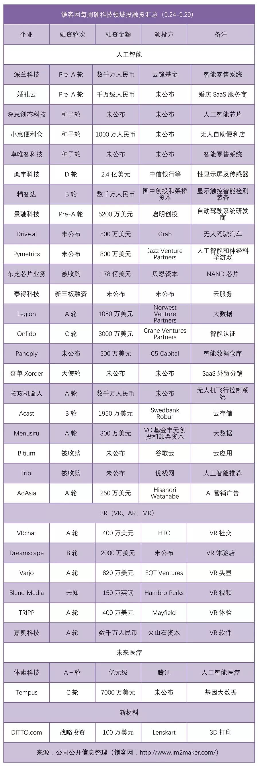 3R(VR、AR、MR)方面,本周获得融资的企业数量明显上升,涉及到硬件、软件以及内容等细分领域;未来医疗领域2起融资事件则依旧与人工智能相关技术挂钩;新材料方面,3D打印领域为本周宠儿。