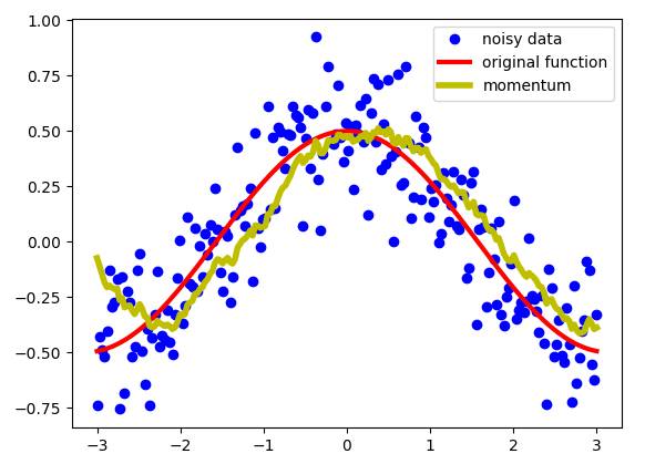 使用随机梯度下降的方法,我们不会计算损失函数的确切导数。相反,我们是对一小批数据进行估算的。这意味着我们并不总是朝着最佳的方向前进,因为我们得到的结果是「嘈杂的」。正如我在上文中列出的图表。所以,指数的加权平均可以提供一个更好的估计值,该估计值比通过嘈杂计算得到的结果更接近实际值的导数。这就是动量法可能比传统 SGD 更好的原因之一。