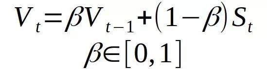 如我们所见,这是一个相当不错的结果。与噪声很大的数据相比,我们得到了更平滑的曲线,这意味着与初始数据相比,我们得到了与原始函数更接近的结果。指数加权平均值用下面的公式定义了新的序列 V: