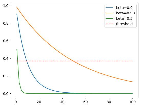 从某些角度来说,该权重小到我们几乎可以说我们「忘记」了这个值,因为其影响小到几乎无法注意到。使用这个近似值的好处在于当权重小于 1 / e 时,更大的 beta 值会要求更多小于 1 / e 的权值。这就是为什么 beta 值越大,我们就要对更多的点积进行平均。下面的图表显示的是与 threshold = 1 / e 相比,随着序列 S 初始值变化,权重变小的速度,在此我们「忘记」了初始值。