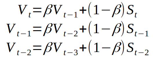 让我们对指数加权平均新序列 V 的三个连续元素的定义进行扩展。