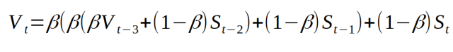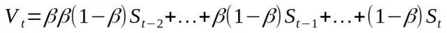 从这个等式中可以看出,新序列的第 T 个值取决于原始序列 S 的所有先前的数值 1…t。来自 S 的所有数值被赋了一定的权重。这个权重是序列 S 的第(t-i)个值乘以(1- beta)得到的权重。因为 Beta 小于 1,所以当我们对某个正数的幂取 beta 时,值会变得更小。所以序列 S 的原始值的权重会小得多,也因此序列 S 对序列 V 产生的点积影响较小。
