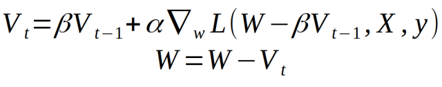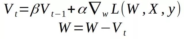 式中 L 是损失函数,三角形符号是梯度 w.r.t 权重,α 是学习率。另一种最流行的表达动量更新规则的方式不那么直观,只是省略了(1 - beta)项。