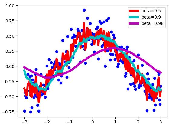 序列 V 是上面的散点图中的黄色部分。Beta 是取值为 0 到 1 的另一个超参数。在上述例子中,取 Beta = 0.9。0.9 是一个很好的值,经常用于具有动量的 SGD 方法。我们可以这样对 Beta 进行直观理解:我们对序列后面的 1 /(1- beta)的点进行近似平均。让我们看看 beta 的选择会对新序列 V 产生怎样的影响。