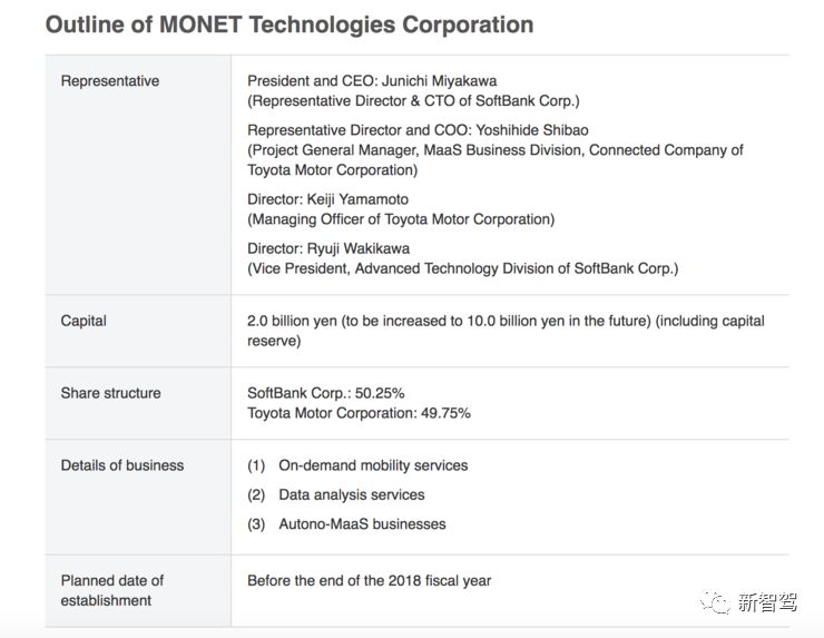 丰田和软银成立的这家新公司被命名为 Monet Technologies(Monet 是 Mobility Network,即移动网络的缩写)。股权方面,软银占 50.25% 的股份,而丰田则持 49.75%。
