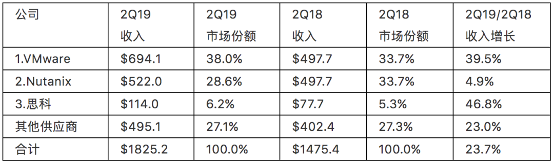 运行VMware超融合软件的系统在2019年第二季度供应商总收入中占到6.941亿美元,占整个市场的38.0%。