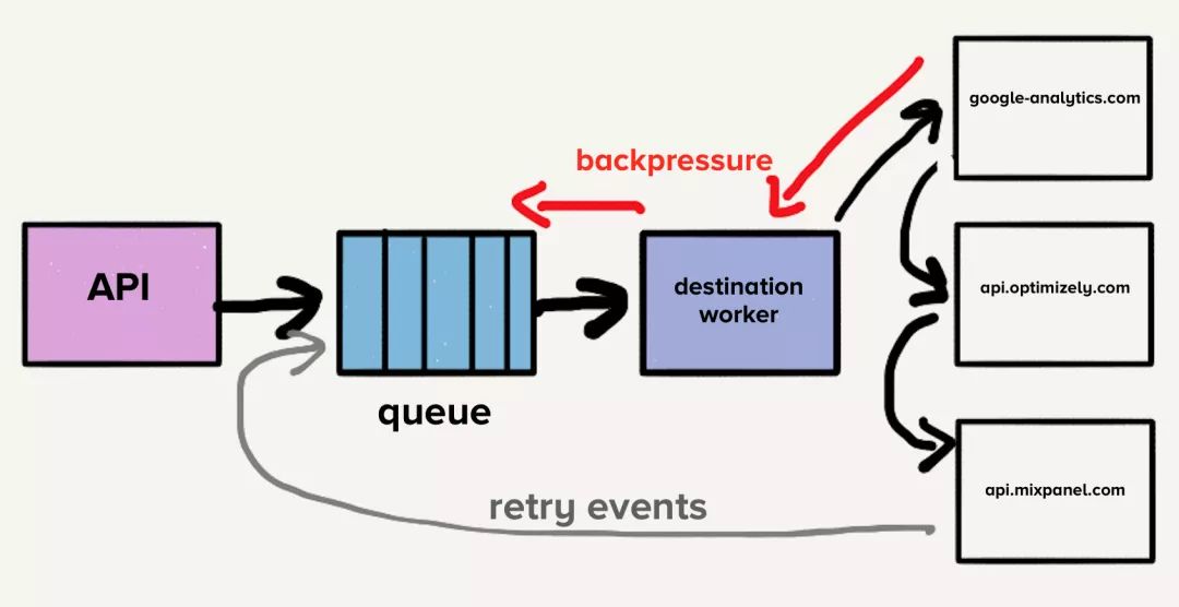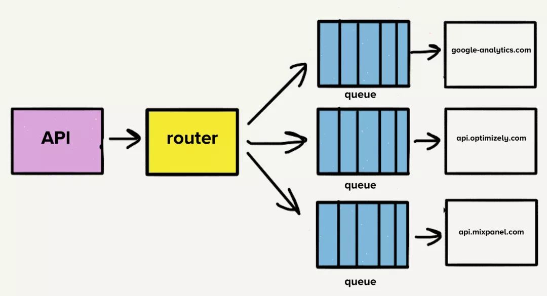 事件是从队列中消耗的,客户的设置会决定这个事件将会发送到哪个目的,这个事件被纷纷发送到每个目的地的API,这很有用。