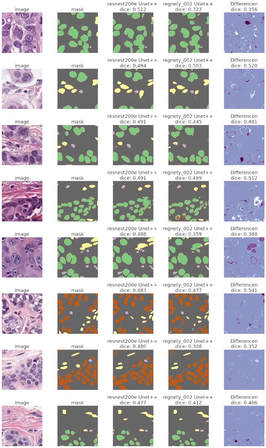 我们可以肯定地说,这个数据集是一项更难的任务 —— 不仅mask不够精确,而且个别的核被分配到错误的类别。然而,使用resnest200e编码器的Unet++仍然表现很好。