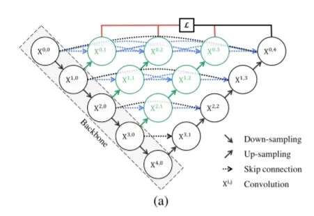 根据论文, Unet++的表现似乎优于原来的Unet。就像在Unet中一样,这里可以使用多个编码器(骨干)来为输入图像生成强特征。