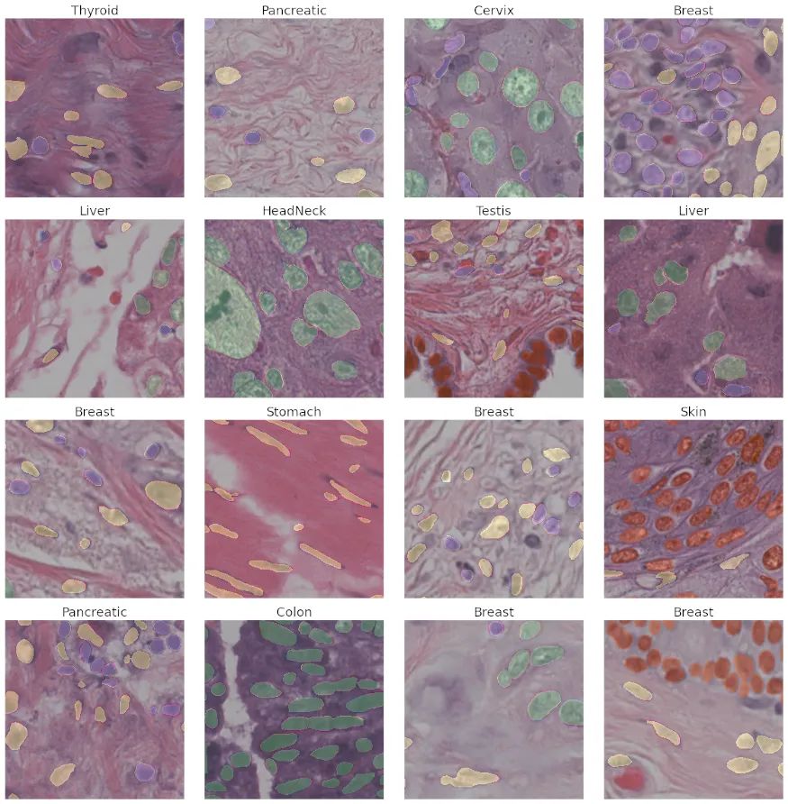 在某些个别情况下,Unet++实际上比Unet更糟糕。但总的来说似乎更好一些。一般来说,对于分割网络来说,这个数据集看起来是一个容易的任务。让我们在一个更难的任务上测试Unet++。为此,我使用PanNuke数据集,这是一个带标注的组织学数据集(205,343个标记核,19种不同的组织类型,5个核类)。数据已经被分割成3个folds。