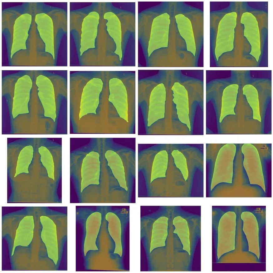 这里我想重点介绍Unet和Unet++,并比较它们使用不同的预训练编码器的性能。为此,我选择使用胸部x光数据集来分割肺部。这是一个二值分割,所以我们应该给每个像素分配一个类为“1”的概率,然后我们可以二值化来制作一个掩码。首先,让我们看看数据。