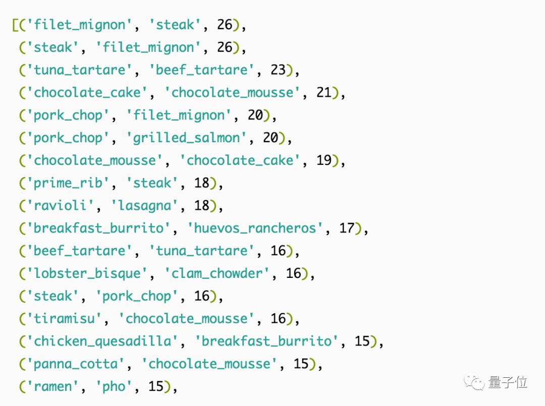 混淆矩阵显示,以下类别的食物经常被错误分类: