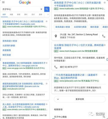 联想到此前今日头条在不同地域展示不同的广告,最终偷偷在三四五线城市投放违规广告的现象,我们可以推测谷歌搜索同样也是为了迎合广告主的需求以及对政策风险的防范。在谷歌的广告上我们就可以看到一组对照作为这个结论的佐证:谷歌上月子中心的广告投放基本上都是针对中国台湾的民众,而这种广告在欧美地区几乎没有。