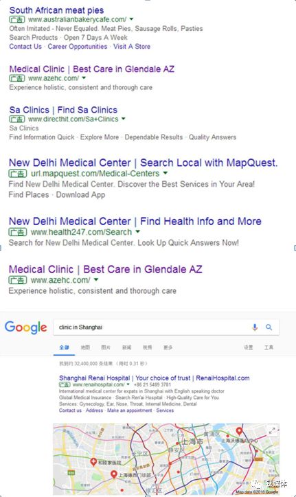 而当我们把搜索的地理位置具体到城市,结果会更精准,例如搜索clinic in New Delhi(新德里),搜索结果会更明确,比搜索南非时的结果更有效。有趣的是,当我们搜索“clinic in Shanghai”的时候,也出现了“上海仁爱医院”的广告,但用中文搜索时不会出现广告结果。