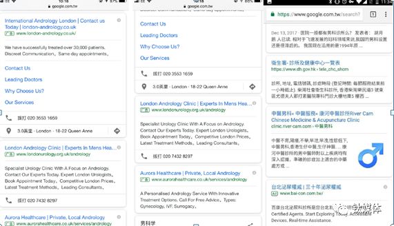 针对男科的广告在欧洲的推广更明显,如在英国搜索“Andrology”首屏都是广告,其中有伦敦本地的男科诊所广告,在中国台湾地区的部分广告还带有“权威”等广告内容背书。