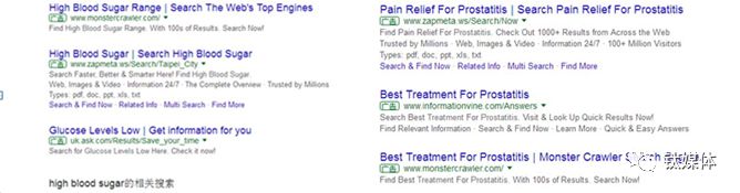 谷歌上对于具体的疾病关键词比如高血糖、前列腺等等都存在少量的广告内容,比如搜索“high blood sugar”或“prostatitis medicine”时会有相应的广告出现,但总体上不算多,类似于前面的城市医院广告,有时搜出来的不带有关键词,属于模糊匹配。