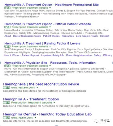 但这也分不同的疾病,有的例如“血友病”关键词下就能看到大量广告,在美国网络环境下通过PC浏览器搜索“hemophilia”,和在中国台湾搜索“月子中心”类似,会出现6-7条结果,其中一半以上都直接提供治疗方案。看来谷歌的疾病广告确实是区别对待的。