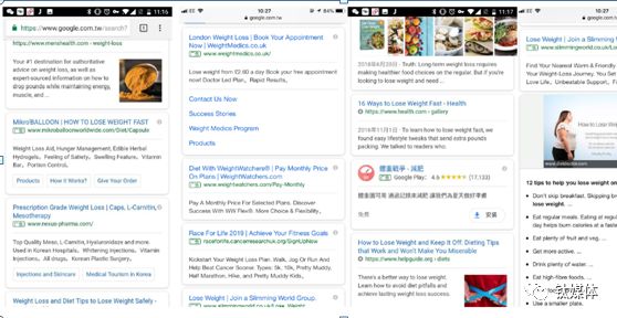 但相比医院、疾病、科室和整形的广告,谷歌的减肥广告数量却非常之多,甚至可以说中国的搜索引擎都不一定有这么多减肥广告。
