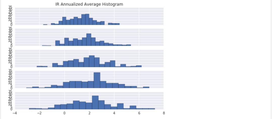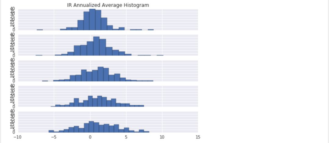 "IR Annualized Average Histogram"五张子图表示,T+1~T+5调仓的因子平均年化收益IR分布图(反映收益稳定性),横坐标为收益的IR,纵坐标为个数。