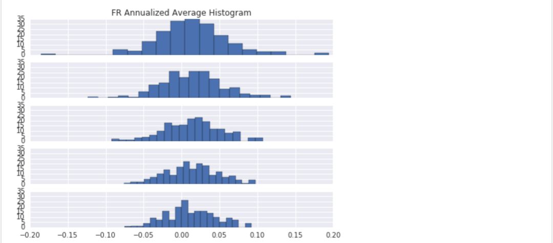 "FR Annualized Average Histogram"五张子图表示,T+1~T+5调仓的因子平均年化收益分布图,横坐标为收益值,纵坐标为个数;