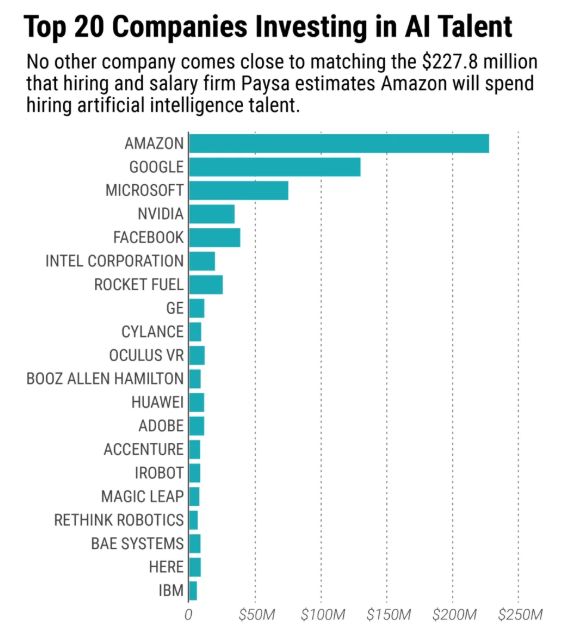 随着基于AI和机器学习架构的商业产品数量的不断增加,对工程师和研究人员的需求也将随之增加。而人才需求的增加可以清晰地反映在世界领先的科技公司水涨船高的工资待遇上。