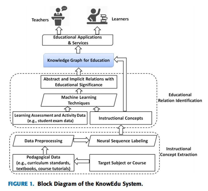 基于知识图的广泛应用和在教育领域日益增长的需求,作者提出了一个名为KnowEdu的系统,以自动构建教育知识图。通过利用教育领域的异构数据(如教学数据和学习评估数据),该系统首先提取科目或课程的概念,然后确定这些概念之间的教育关系。更具体地说,它在教学数据上使用神经序列标记算法来提取教学概念,并在学习评估数据上使用概率关联规则挖掘来识别具有教育意义的关系。