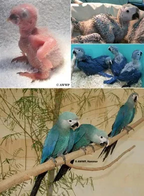 AWWP繁育的1日龄、25日龄、7-8周的小蓝金刚鹦鹉雏鸟与小蓝金刚鹦鹉幼鸟