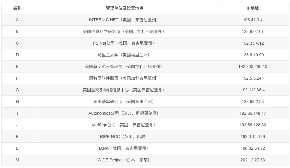 全球的DNS根服务器(IPV4)共有13个,主要分布在美国。除此之外,英国、瑞典、日本各有一个