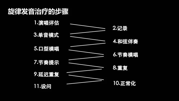 接触了这么多的患者之后,我总结出一套汉语普通话旋律发音治疗的治疗步骤,在这里跟大家分享一下。这个治疗步骤非常多,所以我只给大家讲一些重要的步骤。