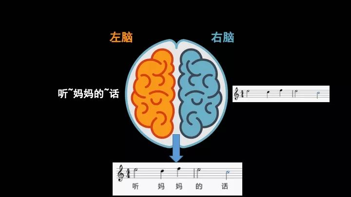 这首《听妈妈的话》大家应该都会唱吧,我们拿这首歌来举例,看一下唱歌时大脑里在发生什么。我们唱歌的时候左右脑同时在活动,右脑主要负责记旋律“3 – 2 4 | 3 – 1 – | 1 5 5 44 2 | 2 – – – |”,左脑主要负责记歌词“听妈妈的话,别让她受伤”,这两条线合并为一条线记忆在了大脑里,于是它们共同输出的时候,就变成了我唱的“听(3 –)妈(2)妈(4)的(3 –)话(1 –),别(1)让(5)她(5 4)受(4 2)伤(2 – – –)”。