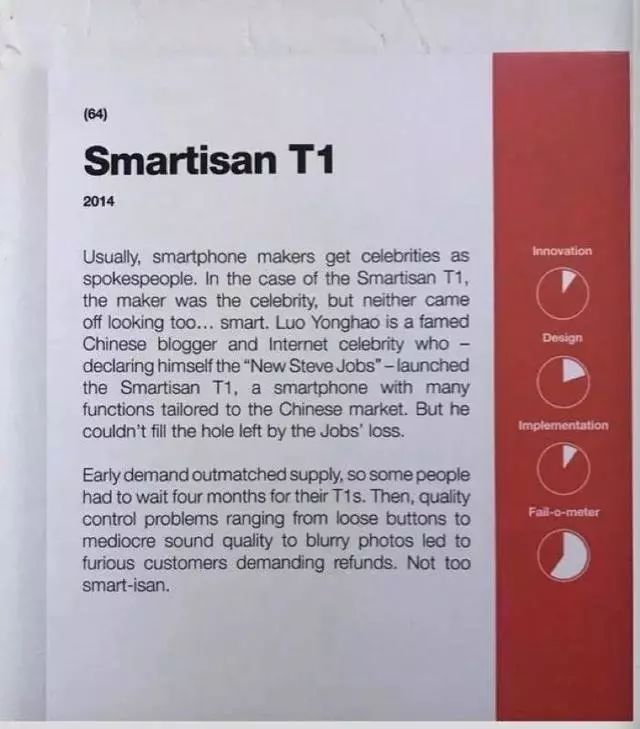 瑞典有一家失败博物馆,专门收藏各种失败的产品设计。2017年,失败博物馆收藏了罗永浩做的 Smartisan T1 ,馆委会说,「Smartisan一开始供不应求,有些人不得不等了四个月才拿到货。然后,从松掉的按键、平庸的音效到模糊的照片,各种质量控制问题暴露出来,愤怒的客户要求退款,看来它并没有那么smart。」