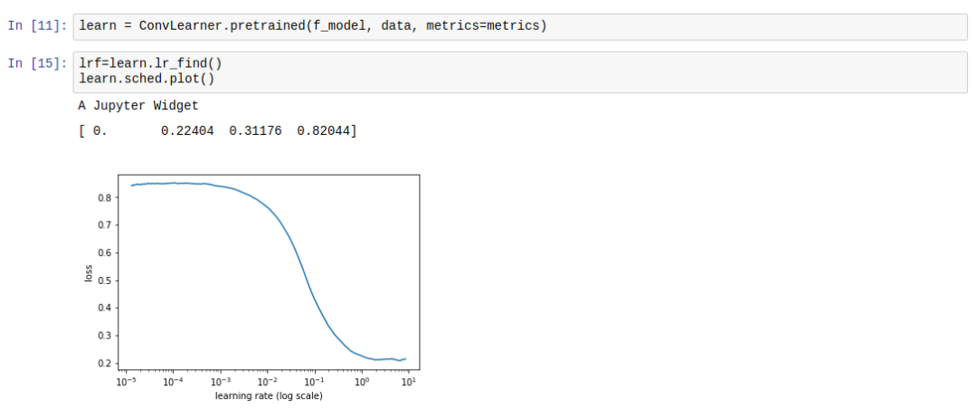 在fastai中,你只需在学习的对象上运行lr_find()函数,学习率退火算法就能发挥效用。同时,sched.plot()函数可以用来确定与最优学习速率相一致的点。