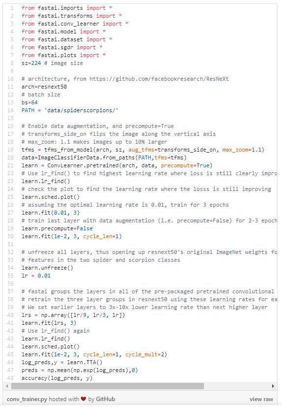 训练集中每个类 [spiders,scorpions] 有290张图片,在测试/验证集中有118张蜘蛛图片和117张蝎子图片。通过一系列训练后,作者采用的模型拥有高达95%的分类准确率。