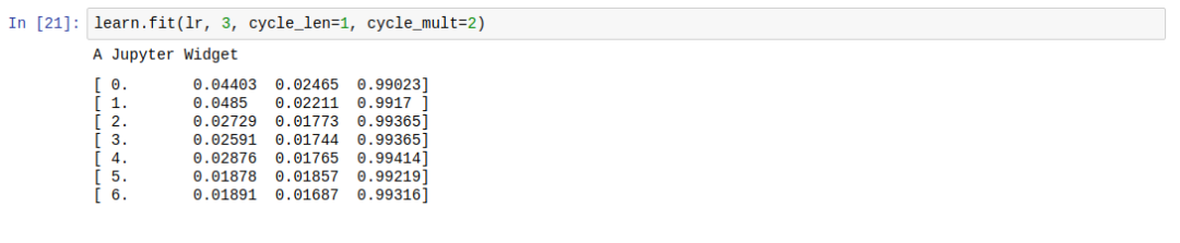 这里的“周期”是指提高学习率的次数。在 fastai 中,可以使用 cycle_len 和 cycle_mult 参数来设置 learner.fit。