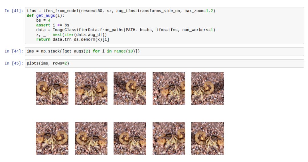 一个例子是蜘蛛与蝎子图片分类的挑战。 在这个数据集中,许多图片进行了垂直变换后,里面的动物仍能正常显示。 这就是所谓的 transforms_side_on。