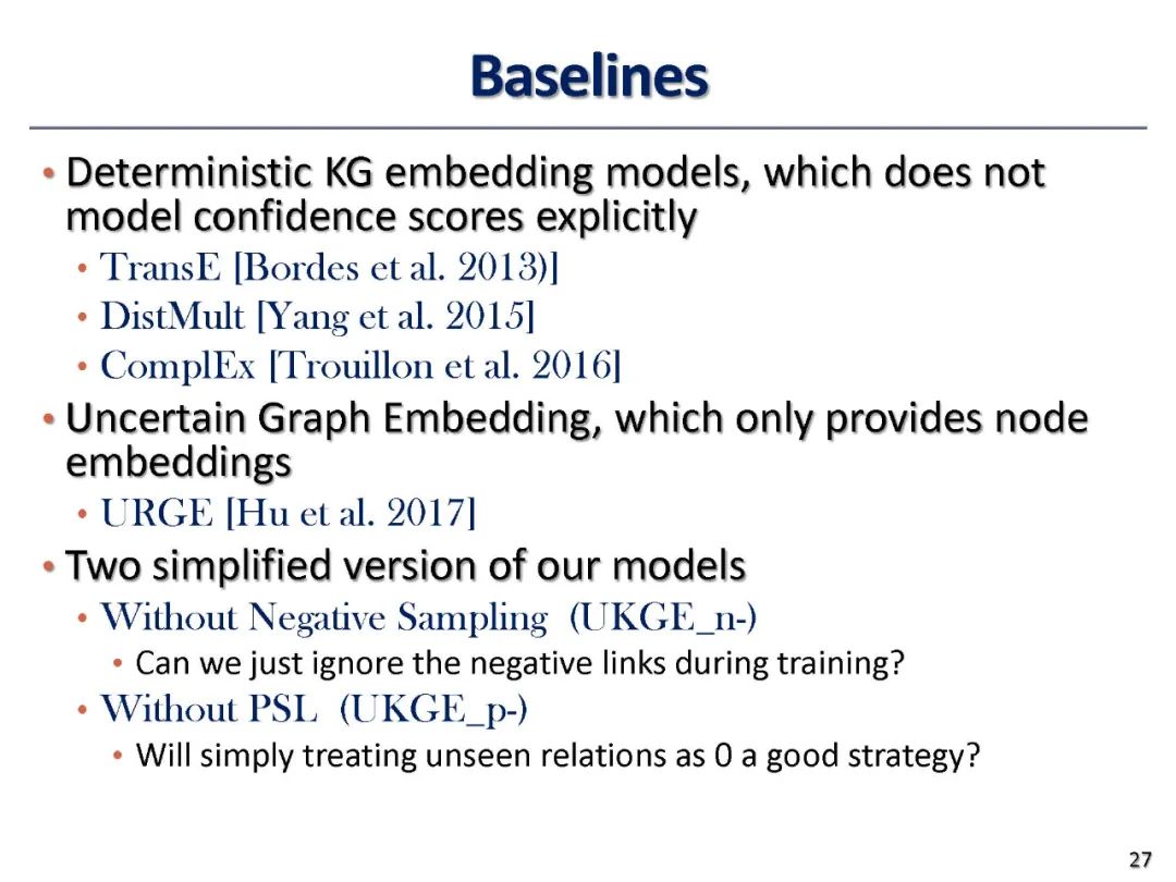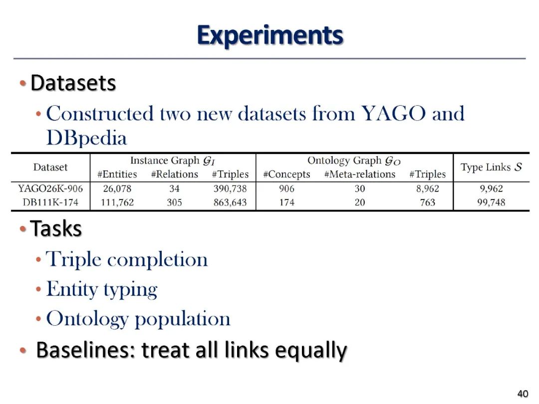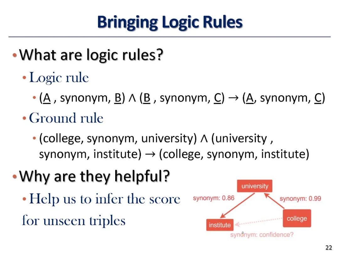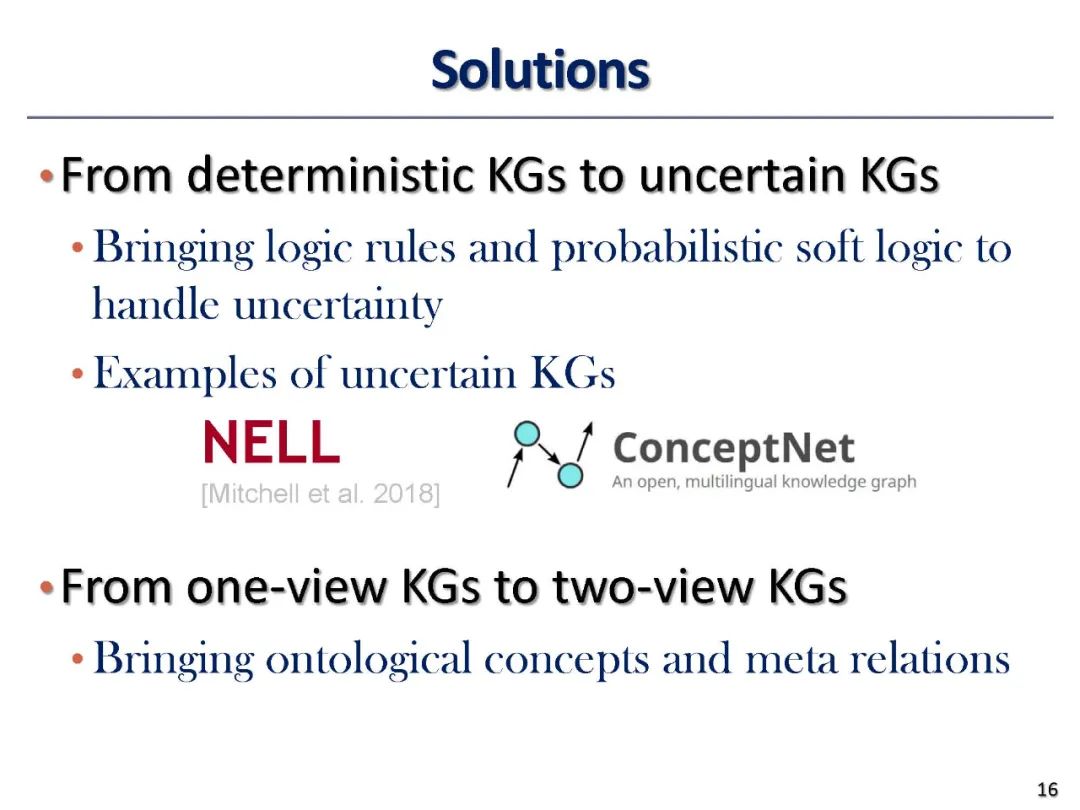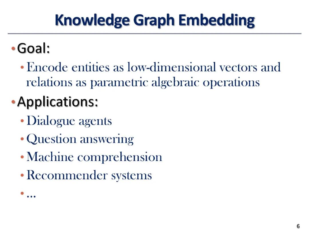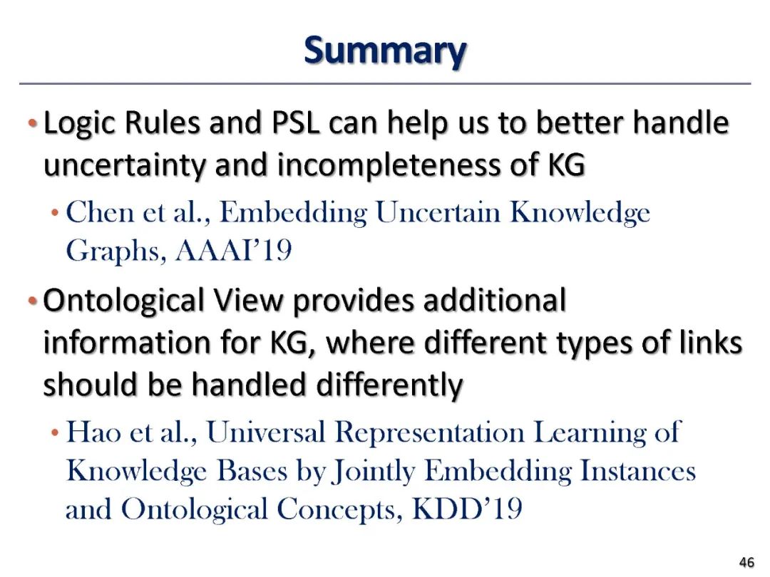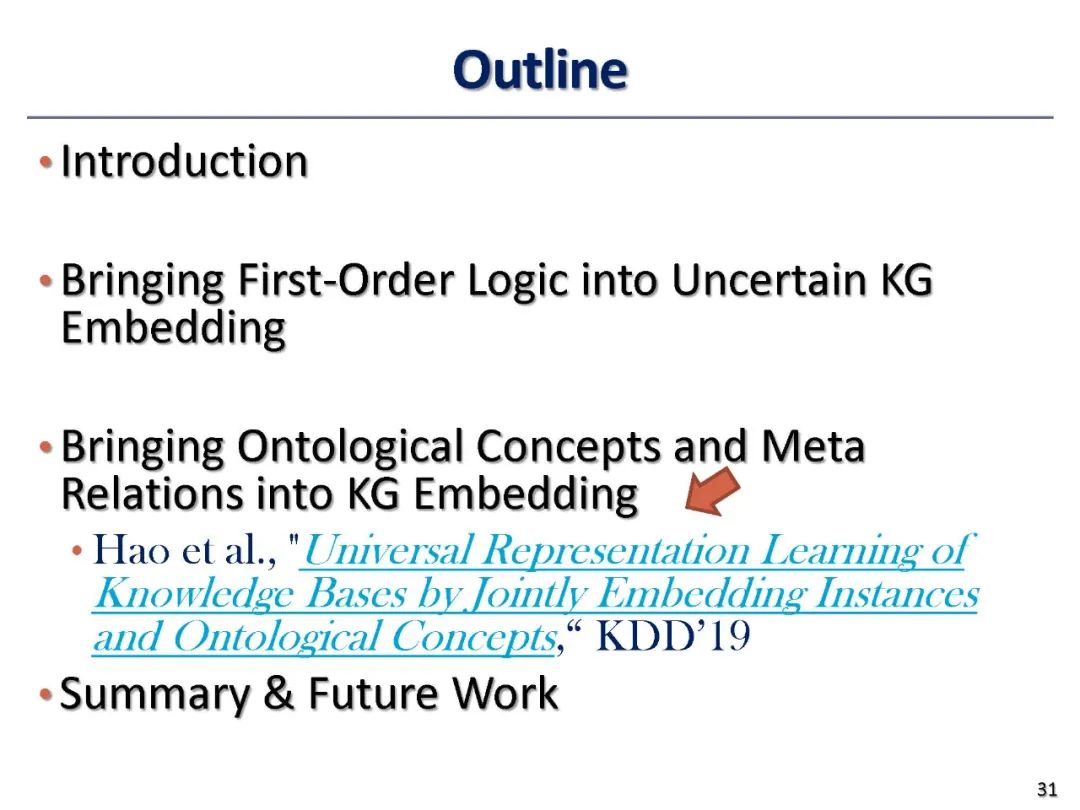 知识图谱由于其广泛的应用,如搜索引擎和问答系统,近年来受到了极大的关注。知识图谱嵌入是将实体表示为低维向量,并将关系表示为低维向量上的算子,在知识推理等任务中得到了广泛的研究和成功的应用。在本教程中,我们将介绍最新的知识图谱表示学习技术,它包含三个部分。首先,我们将回顾通常基于浅层嵌入的知识图谱表示技术,如TransE、DisMult和RotatE。其次,我们将讨论如何集成额外的符号信息,如逻辑规则和本体论,以更好地学习知识图谱的表示的最新进展。在第三部分中,我们将介绍图神经网络(GNNs)和最近在异构信息网络中研究的进展,图神经网络可以被认为是知识图谱的一般形式。