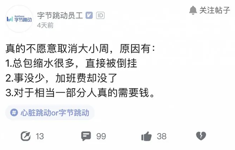 一名字节跳动员工发帖表示,支持大小周的都是想利用大小周多赚钱。取消了大小周,工作量不变,但周末固定的加班费没了,导致总包缩水,薪资倒挂。