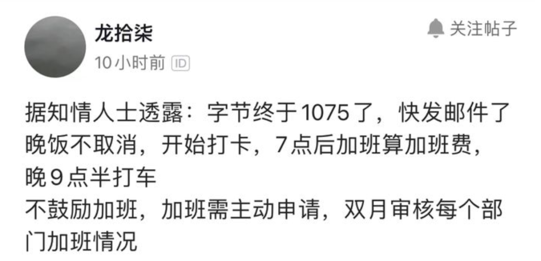 字节开启1075工作制!加班需申请,最多3小时