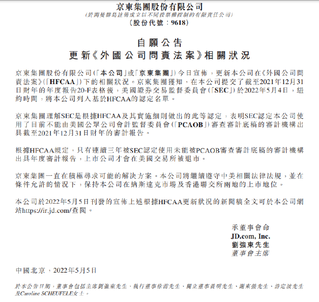 对此京东在港交所公告称,一直在积极探索可能的解决方案,将继续遵守中美两国的适用法律法规,努力保持在纳斯达克和香港联交所的上市地位。
