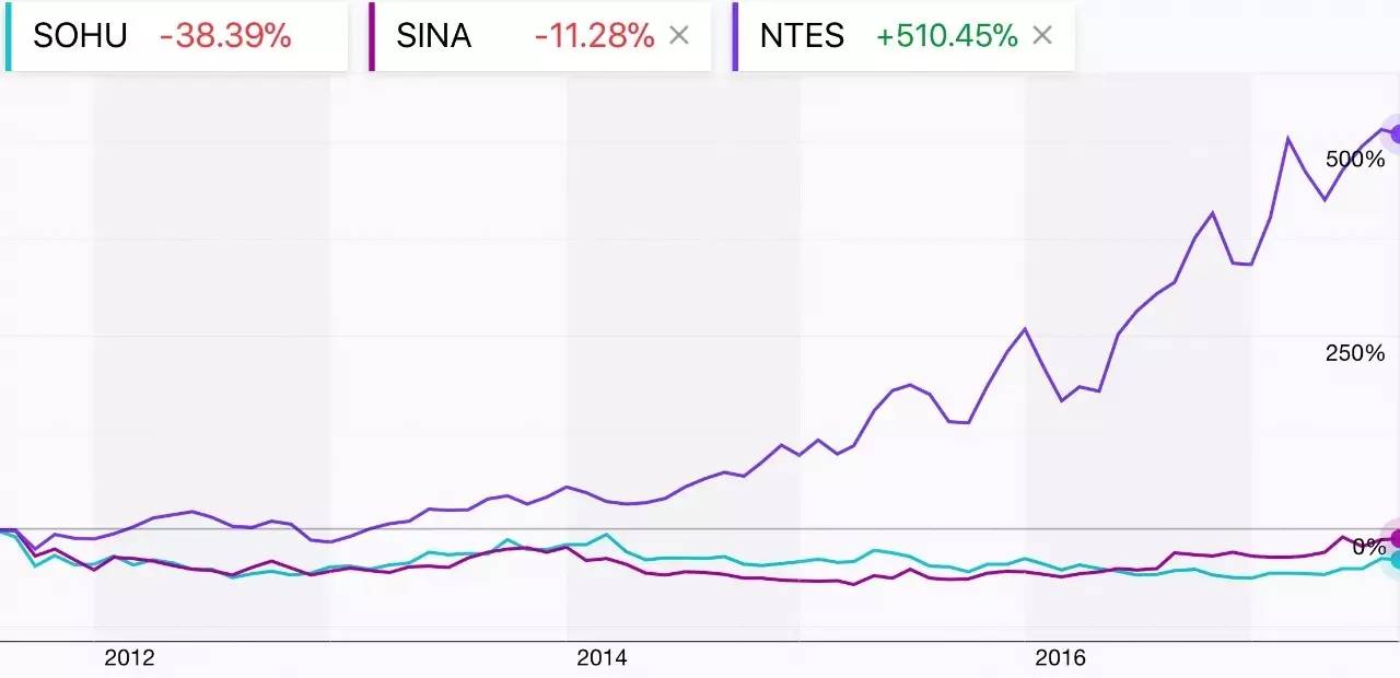 过去6年老三大门户搜狐(SOHU)、新浪(SINA)和网易(NTES)股价对比